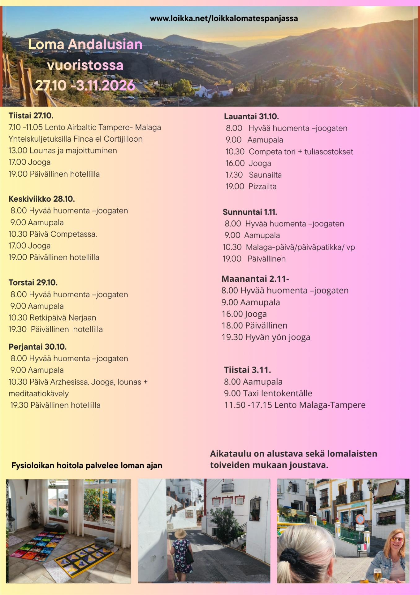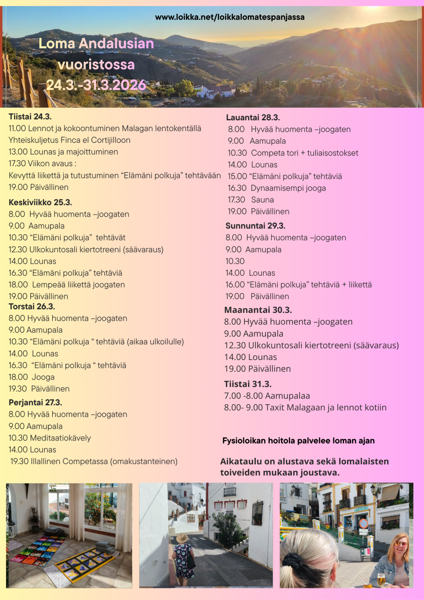 Tarkka ohjelma räätälöidään jokaiselle lomalle erikseen ja voit alta tutustua vuoden 2026 ohjelmiin. Lomalla ei aika käy pitkäksi vapaa-aikaa ja rentoutumista unohtamatta. Pidätämme oikeuden aikataulumuutoksiin.