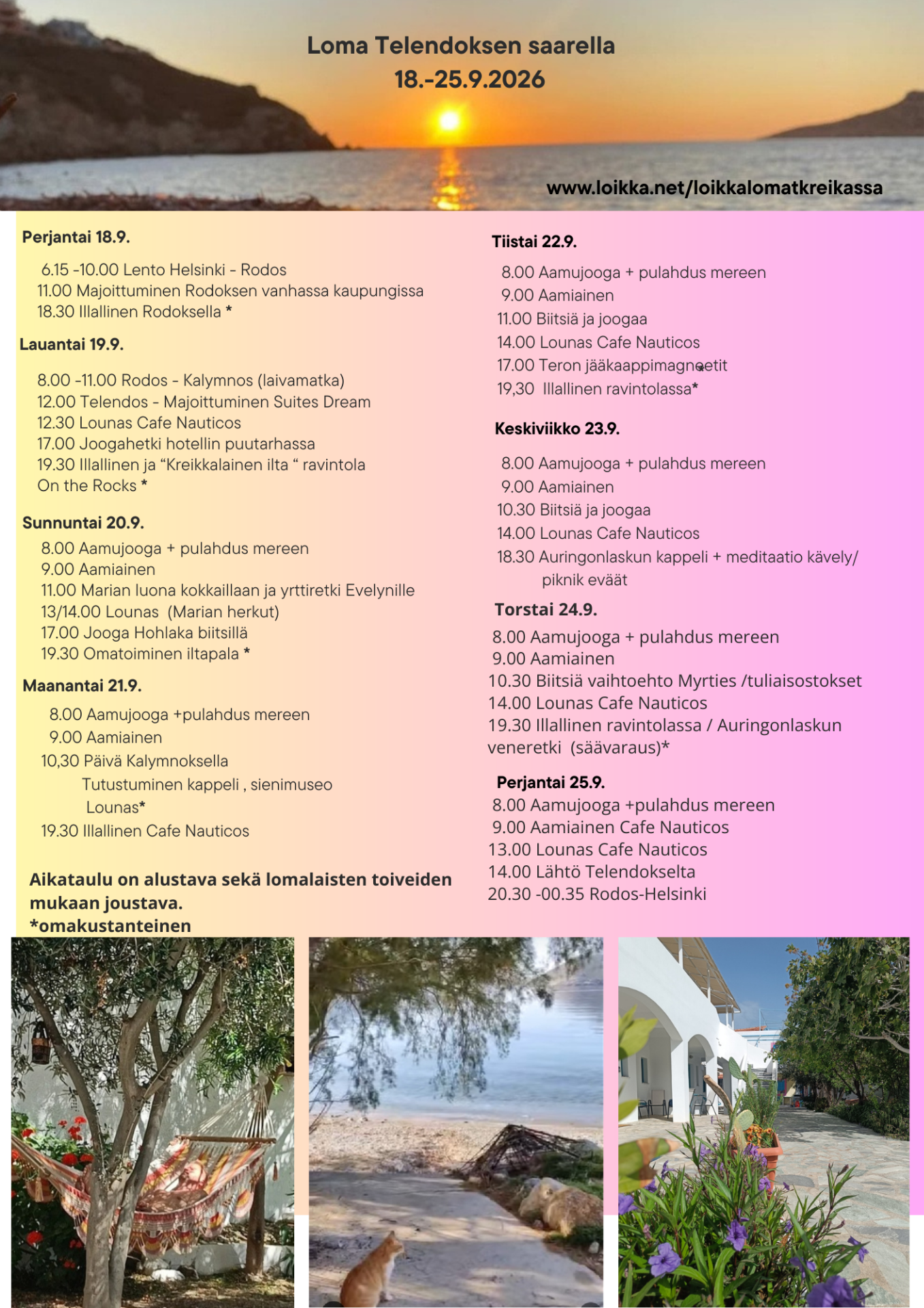Paluu: Perjantai 25.9.2026 Rodos- Helsinki 20.30 -00.35 Finnair